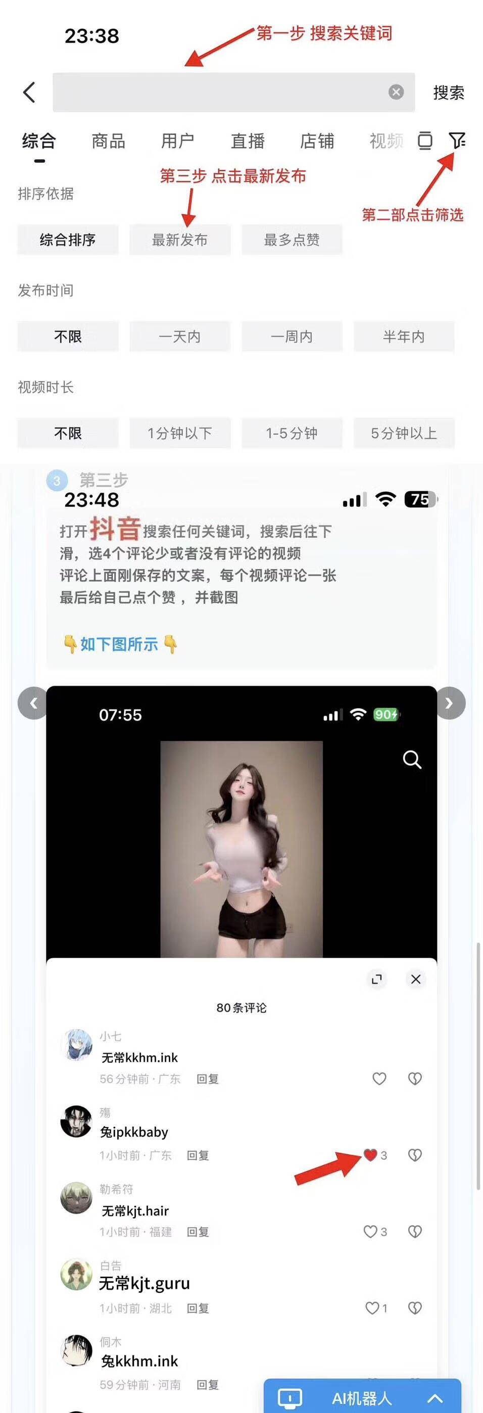 打开抖音搜索关键词,搜索后往下滑,选4个评论少或者没有评论的视频